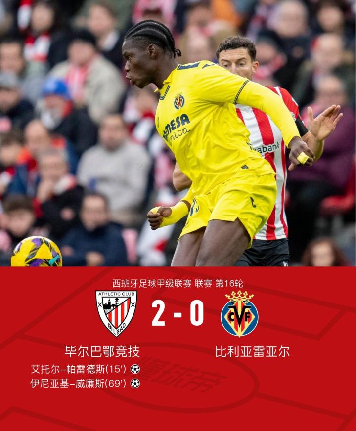 在西班牙足球甲级联赛第16轮的比赛中,毕尔巴鄂竞技坐镇主场迎战比利亚雷亚尔。比赛中,毕尔巴鄂竞技展现了出色的进攻能力。首先,德加拉雷塔送出精妙助攻,艾托尔-帕雷德斯成功破门,为球队首开纪录。随后,桑切特也贡献了一次关键助攻,帮助伊尼亚基-威廉斯再下一城。最终,毕尔巴鄂竞技以2-0的比分战胜比利亚雷亚尔,取得了本场比赛的胜利。