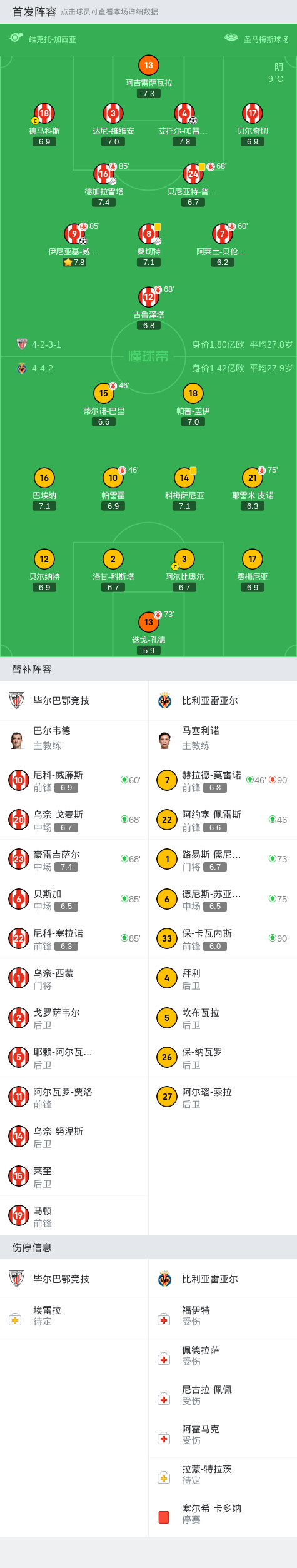 毕尔巴鄂竞技2-0比利亚雷亚尔,帕雷德斯、伊尼亚基-威廉斯破门