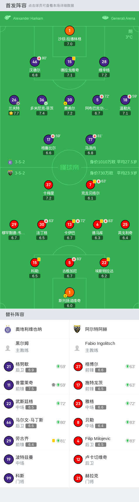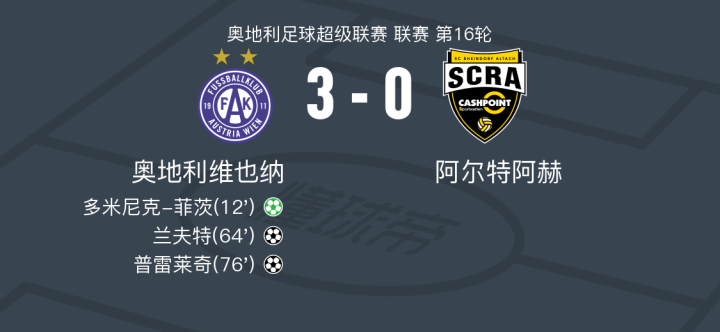 奥地利维也纳3-0大胜阿尔特阿赫,普雷莱奇破门,兰夫特建功