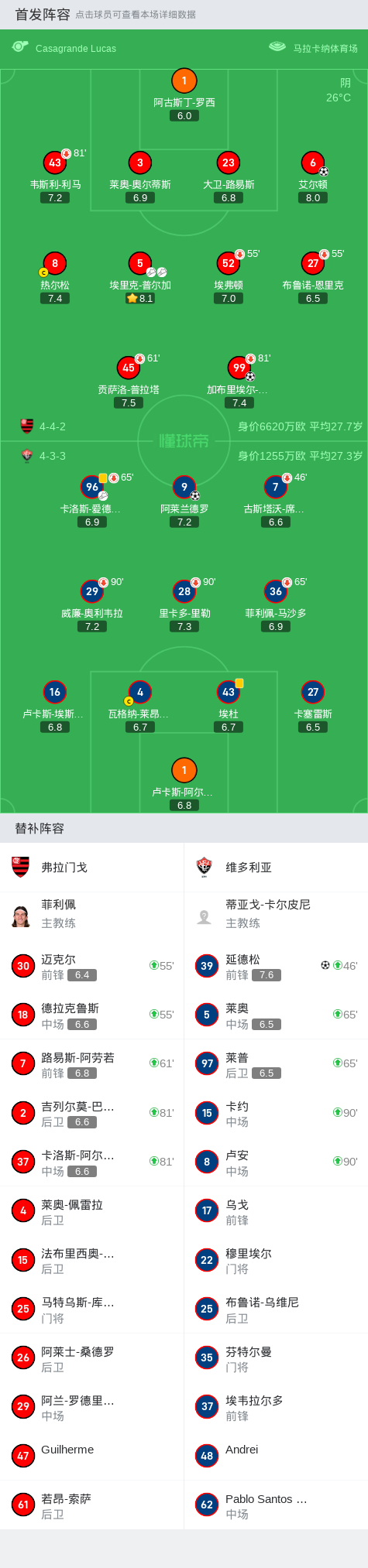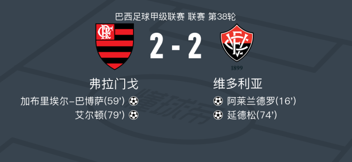 在巴西足球甲级联赛第38轮的较量中,弗拉门戈坐镇主场迎战维多利亚。比赛中,维多利亚的阿莱兰德罗率先破门,为球队取得领先。随后,弗拉门戈的加布里埃尔-巴博萨在队友埃里克-普尔加的助攻下扳平比分。维多利亚的延德松再次为球队取得领先,但弗拉门戈的艾尔顿在埃里克-普尔加的再次助攻下将比分扳平。最终,双方以2-2握手言和。