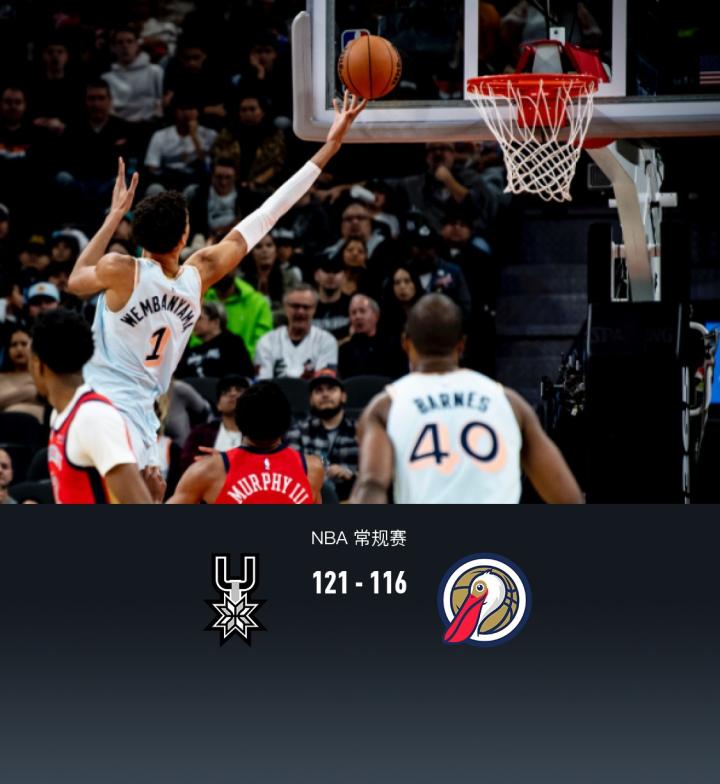 第四节马刺斯蒂芬-卡斯尔拿下12分,鹈鹕特雷-墨菲拿下9分,最终马刺121-116战胜鹈鹕