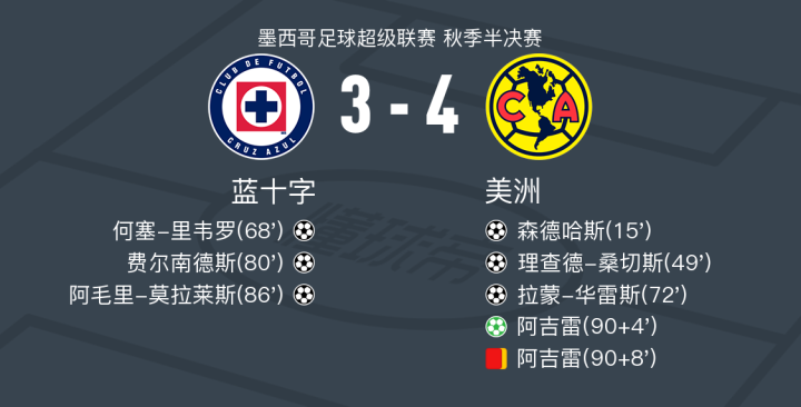 在墨西哥足球超级联赛秋季半决赛中,蓝十字坐镇主场迎战美洲。比赛中,美洲队的森德哈斯在理查德-桑切斯的助攻下率先破门,随后理查德-桑切斯再度建功,为美洲队扩大了领先优势。蓝十字队不甘示弱,皮奥维助攻何塞-里韦罗扳回一城。然而,美洲队的拉蒙-华雷斯在阿尔瓦罗-菲达尔戈的助攻下再次将比分拉开。蓝十字队的费尔南德斯在豪尔赫-桑切斯的助攻下再度缩小差距,紧接着阿毛里-莫拉莱斯也为蓝十字队贡献了一粒进球,将比分追平。比赛接近尾声时,美洲队的阿吉雷通过点球再次将比分反超。最终,美洲队以4比3险胜蓝十字,成功晋级。比赛中,阿吉雷因累计两张黄牌被罚下场。
