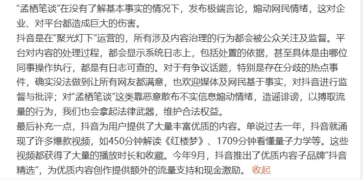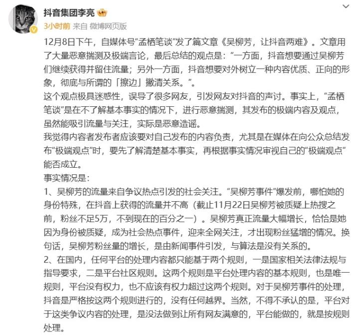 北京时间12月9日,针对自媒体公众号“孟栖笔谈”发布的文章《吴柳芳,让抖音两难》,抖音集团副总裁李亮今日在社交媒体发文进行驳斥,表示文章用大量恶意揣测及极端言论,散布不实信息,煽动情绪,平台将利用法律武器,维护自己的合法权益。且李亮表示,吴柳芳粉丝的快速增长并不是由算法操控的,而是由新闻事件所引发,平台对吴柳芳账号所采取的一系列举措都是在法律法规和社区规则之下进行的。