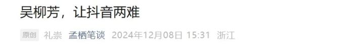 12月8日,自媒体账号“孟栖笔谈”发布了一篇名为《吴柳芳,让抖音两难》的文章。在文章中,作者表示在吴柳芳事件中,抖音处于两难境地,一方面,抖音想要通过“吴柳芳们”继续获得流量,巩固自己的优势地位;另外一方面,平台也想要对外树立一种内容优质、正向的形象,彻底与所谓的“擦边”撇清关系。