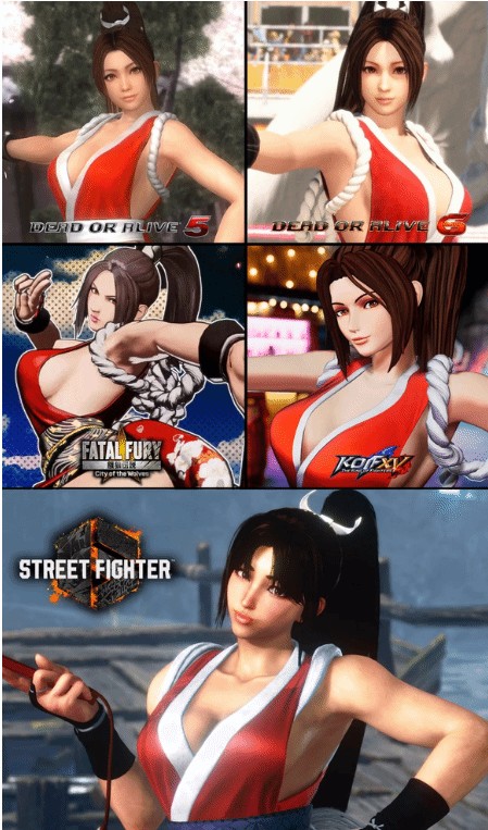 不知火舞是《饿狼传说》《拳皇》系列中的人气女角色,曾跨界联动《街头霸王》《忍者必须死》《和平精英》等游戏。在不同作品中,她的形象既延续了原作的标志性特点,又在细节上有所创新。
