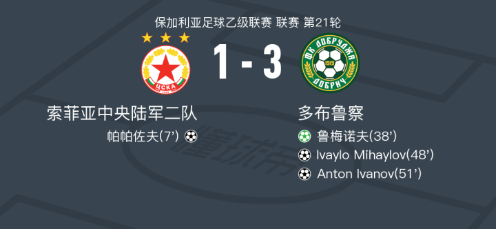 多布鲁扎1919 3-1逆转索菲亚中央陆军二队,Anton Ivanov、Ivaylo Mihaylov破门