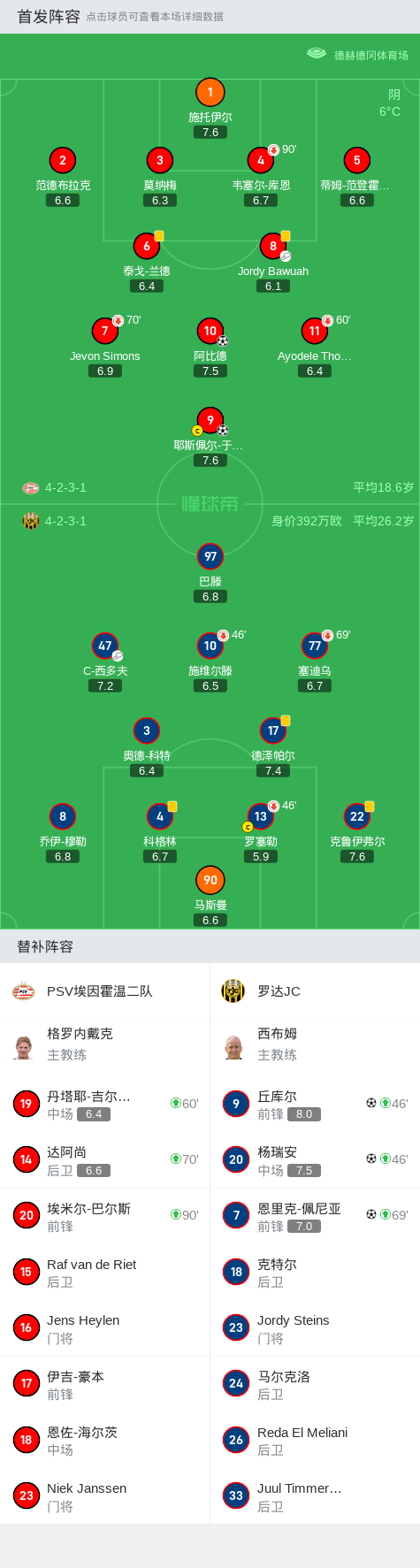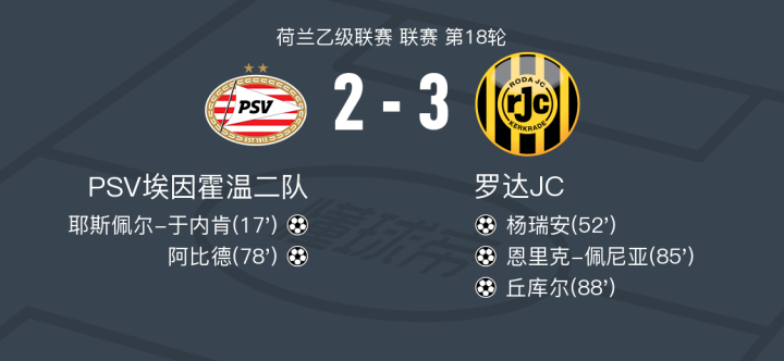 在荷兰乙级联赛第18轮的较量中,PSV埃因霍温二队坐镇主场迎战罗达JC。比赛中,PSV埃因霍温二队的耶斯佩尔-于内肯率先为球队取得领先。随后,罗达JC的杨瑞安扳平比分。PSV埃因霍温二队的Jordy Bawuah送出精彩助攻,帮助阿比德再次将比分超出。然而,罗达JC展现出顽强的斗志,恩里克-佩尼亚和丘库尔接连破门,最终帮助球队逆转取胜。比赛以PSV埃因霍温二队2-3不敌罗达JC告终。
