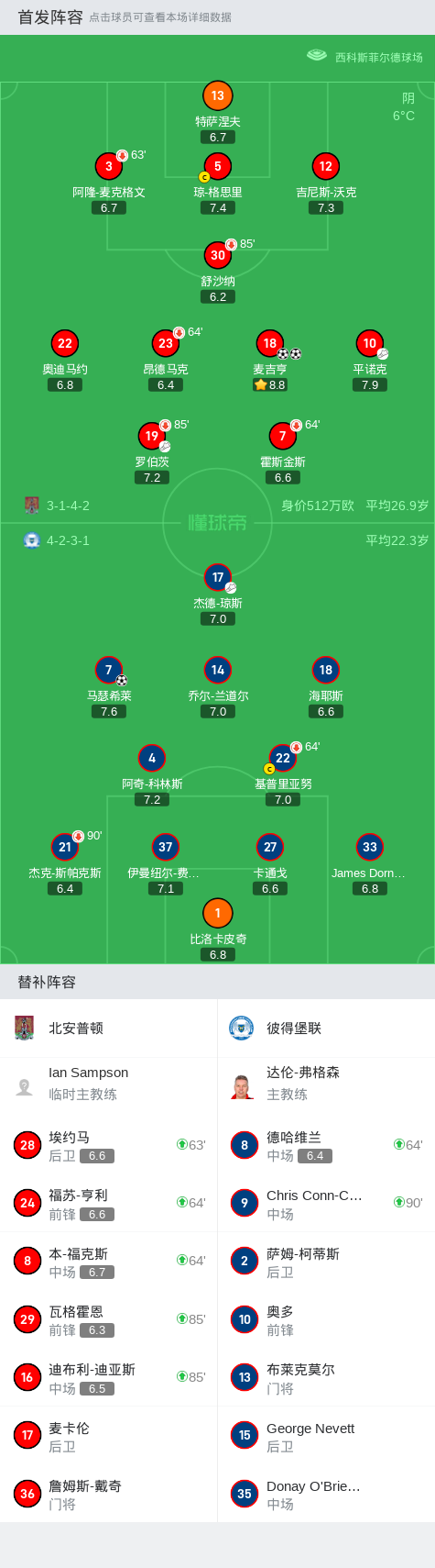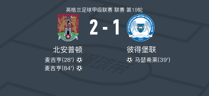 北安普顿2-1彼得堡联,麦吉亨独中两元