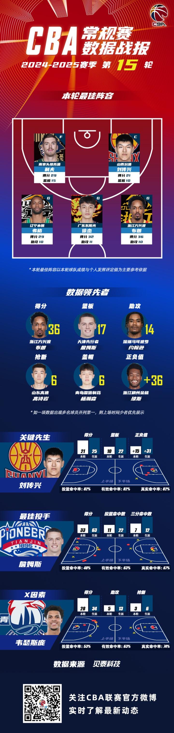 数据领先者方面,浙江广厦球员布朗以单场36分的数据领衔得分榜;