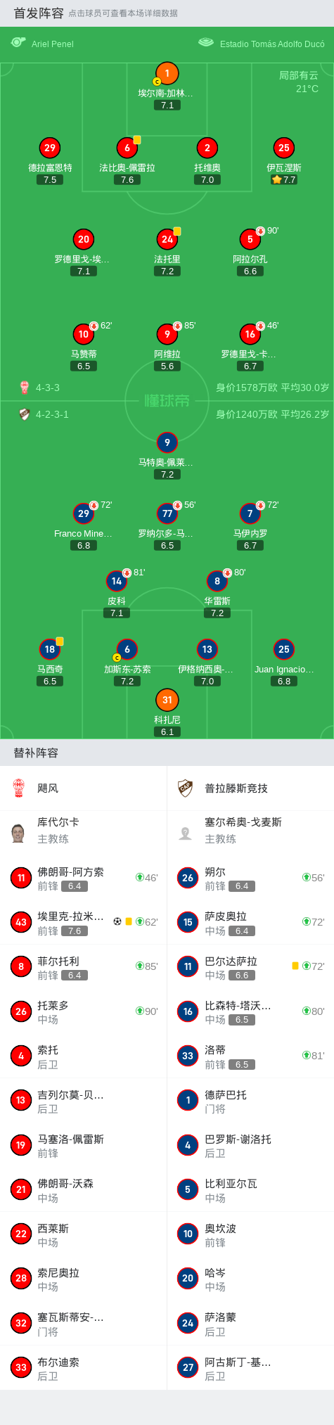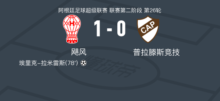 在阿根廷足球超级联赛第二阶段的较量中,飓风队坐镇主场迎战普拉滕斯竞技。比赛中,飓风队的埃里克-拉米雷斯成功破门,为球队取得领先。最终,飓风队以1比0战胜普拉滕斯竞技,取得了本场比赛的胜利。