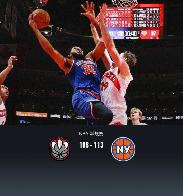 第四节猛龙RJ-巴雷特拿下6分,尼克斯唐斯拿下10分,最终猛龙108-113不敌尼克斯