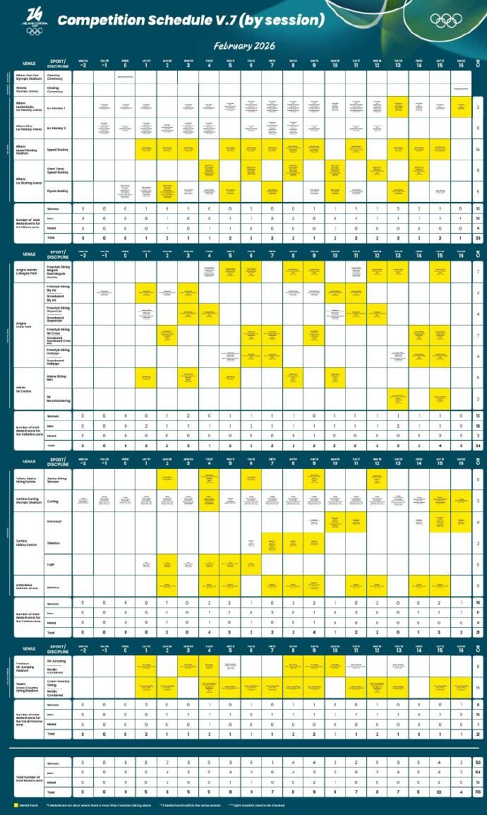 北京时间12月10日,2026米兰冬奥组委公布了详细赛程。首金将在2月7日的高山滑雪男子滑降比赛中产生,首个比赛日,卫冕冠军苏翊鸣也将冲击单板滑雪男子大跳台的金牌。