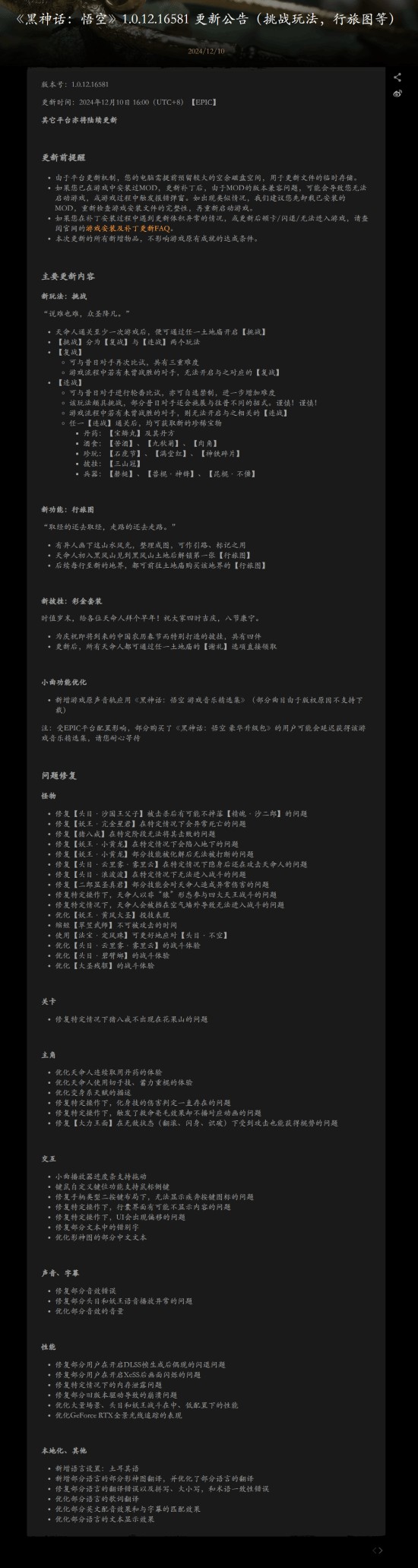 12月10日,《黑神话:悟空》迎来全新更新,新增了挑战玩法、新功能行旅图、新披挂彩金套装等,同时修复了众多问题,新增了土耳其语,更新版本号为1.0.12.16581,目前暂时只有Epic版本更新,其它平台后续将陆续更新。值得一提的是,在新挑战玩法里的连战里,部分Boss还会施展与往昔不同的招式。