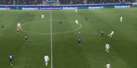 而且在姆巴佩获得机会的时候,你可以看到皇马的其他球员的位置已经发生了很大的变化,维尼修斯已经跑到了右路,只剩下姆巴佩在中路对付亚特兰大的中卫: