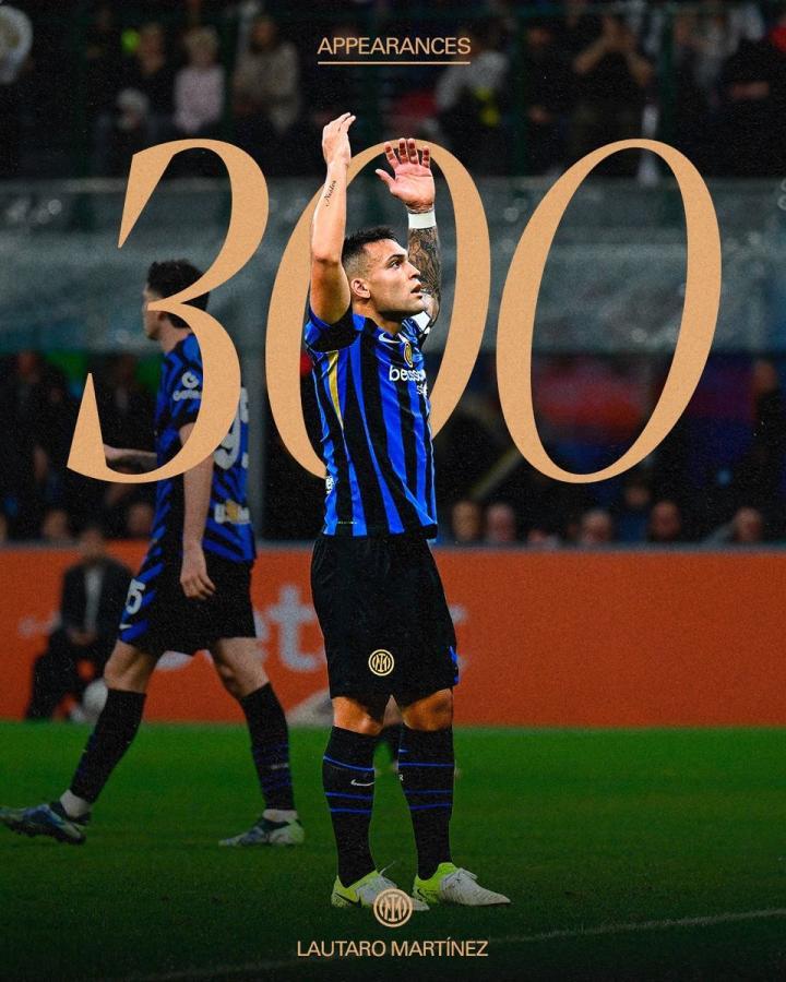 因此,与勒沃库森的欧冠比赛中,劳塔罗-马丁内斯正式达成国米生涯300场里程碑。