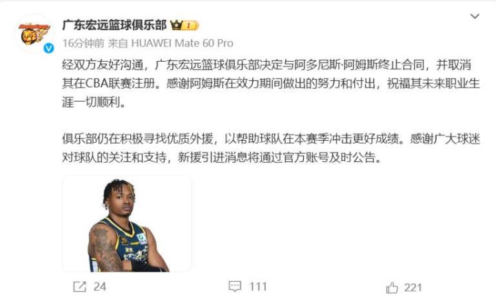 广东男篮官方也在社媒上宣布了与阿姆斯终止合同的消息。