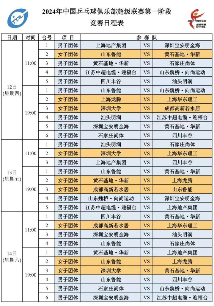 目前第一阶段前三天赛程已经确定。其中今天上午11点,樊振东、许昕所在的上海地产集团和王楚钦、梁靖崑所在的山东魏桥以及王曼昱、钱天一、陈幸同所在的山东鲁能女队均将出战。