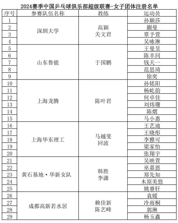 女子方面,去年冠军深圳大学队的核心球员之一陈梦虽然没有出现在注册名单中,但是有孙颖莎、蒯曼、覃予萱以及中国香港球员吴咏琳,她们依然是冠军的最有利竞争者之一。去年亚军山东鲁能队则在保留了王曼昱、陈幸同、钱天一、范思琦的原有班底基础上,增补了年轻球员徐奕。