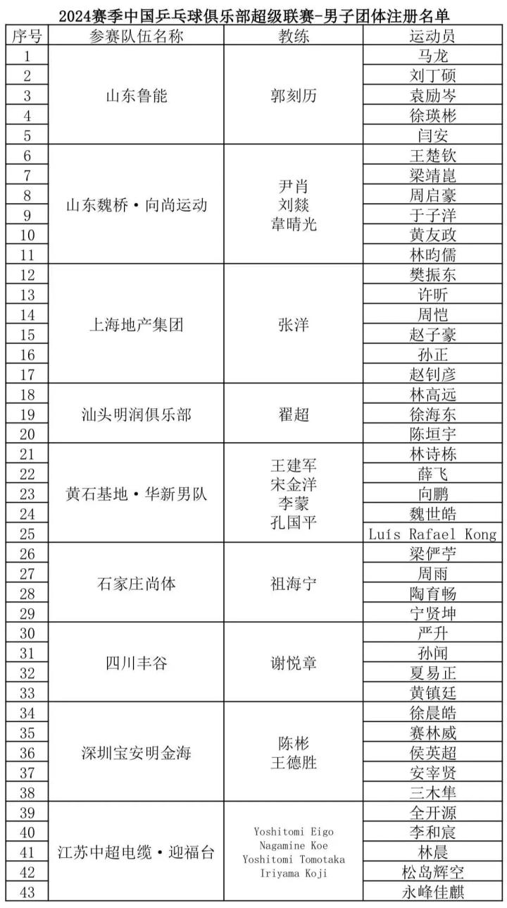 在已经公布的注册名单中,男子团体卫冕冠军山东鲁能队基本延续了上一届的阵容,注册名单为:马龙、刘丁硕、袁励岑、徐瑛彬、闫安。但马龙目前前往挪威参加老瓦杯,将缺席本阶段乒超比赛。