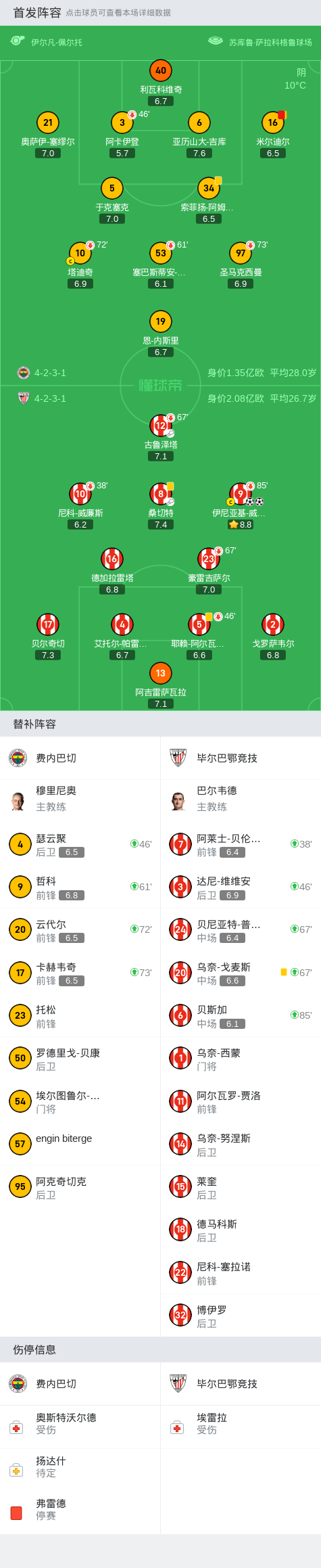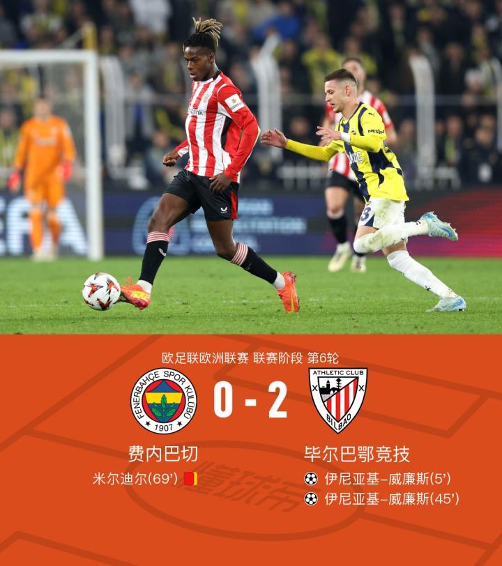 费内巴切0-2毕尔巴鄂竞技,伊尼亚基-威廉斯双响,米尔迪尔染红