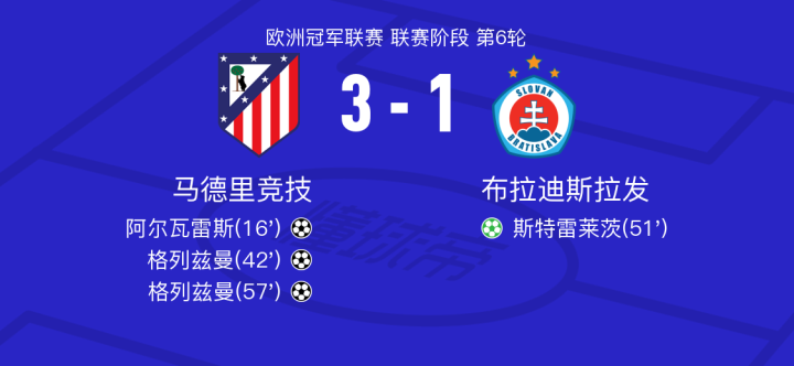 马德里竞技vs布拉迪斯拉发球员评分:格列兹曼8.9分,塞萨尔-布莱克曼6.0分