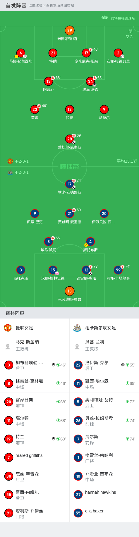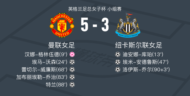 曼联女足5-3纽卡斯尔联女足,特兰破门,加布丽埃勒-乔治建功