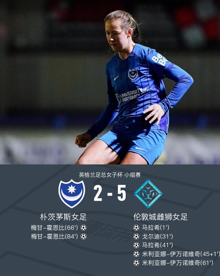 在英格兰足总女子杯小组赛中,朴茨茅斯女足迎战伦敦城雌狮女足。比赛中,伦敦城雌狮展现了强大的进攻实力。马拉希率先为球队打开局面,并在伊穆兰的助攻下再度破门,完成梅开二度。戈尔迪也为球队贡献了一粒进球,而米利亚娜-伊万诺维奇同样表现出色,凭借露西-菲茨杰拉德的助攻,成功打入两球。 尽管朴茨茅斯女足在比赛中面临巨大压力,但梅甘-霍恩比的出色表现为球队挽回了一些颜面,她在比赛中同样打入两球,展现了不俗的个人能力。最终,伦敦城雌狮女足以5-2的比分战胜朴茨茅斯女足,取得了比赛的胜利。