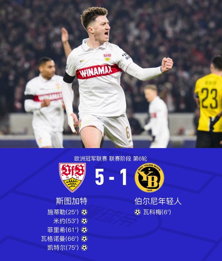 斯图加特5-1逆转伯尔尼年轻人,瓦格诺曼、米约传射,法比安-里德助攻帽子戏法