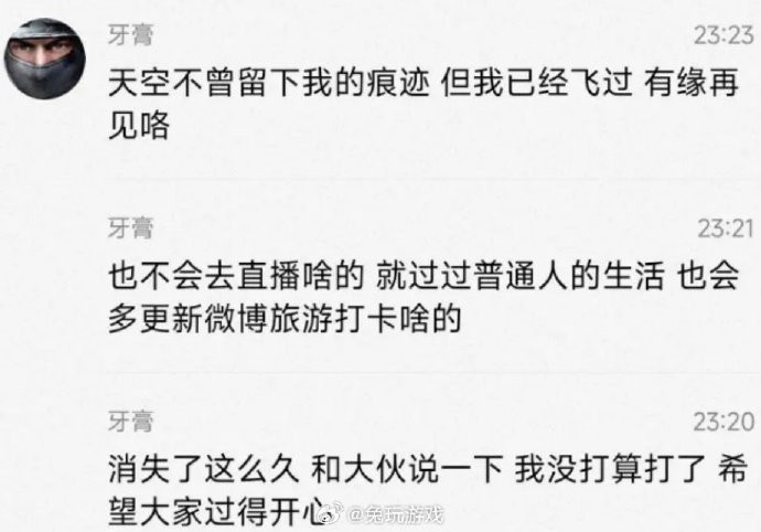 聊天记录中,Yagao表示:“天空不曾留下我的痕迹,但我已经飞过,有缘再见。不会去直播啥的,就过过普通人的生活,也会多更新微博旅游打卡啥的。消失了这么久,和大伙说一下,我没打算打了,希望大家过得开心。”