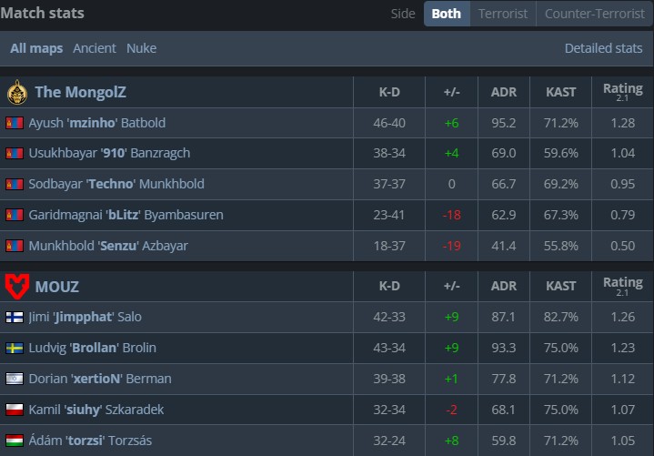 此役蒙古队两图开局都手握优势被逆转,队内步枪手Senzu全场梦游,全场仅18杀rating0.5全队垫底。相比此前的两轮瑞士轮阶段,Senzu状态全无,rating下降0.88,Impact更是只有离谱的0.22。