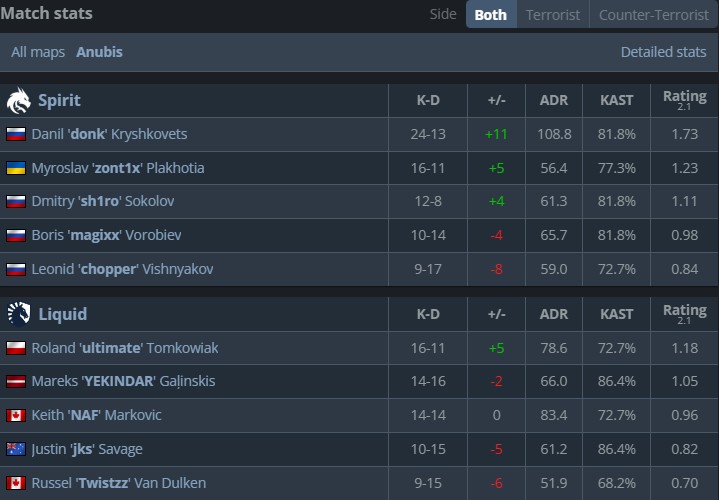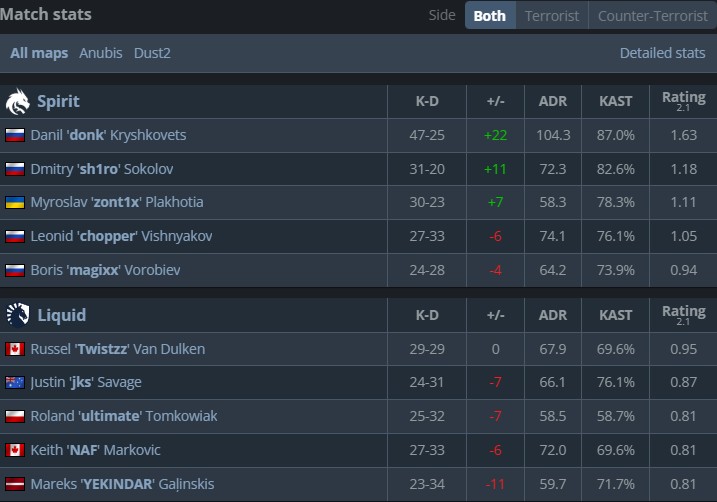 绿龙进攻方手枪局打B,依靠迅速的补枪获得3-0开局。近3个月内,液体7次沙二仅获胜1次,胜率为14%,Spirit明显展示出了更出色的地图理解,magixx与donk频频打出突破拿分,但液体依靠总监和jks的兜底连续扳回3分,上半场Spirit暂以7-5领先。