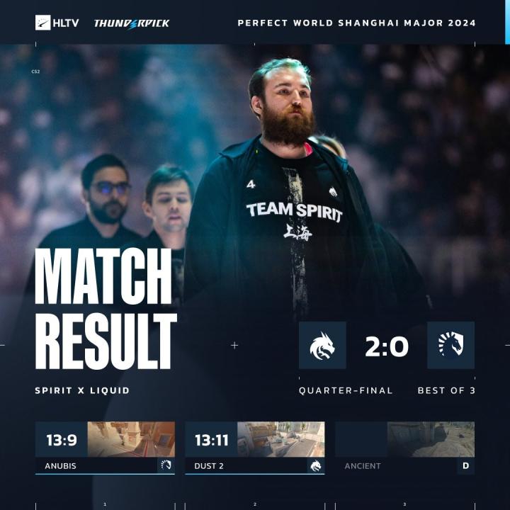 北京时间12月12日,CS2上海Major决胜组,Spirit击败Liquid晋级四强,将在半决赛中迎战MOUZ。