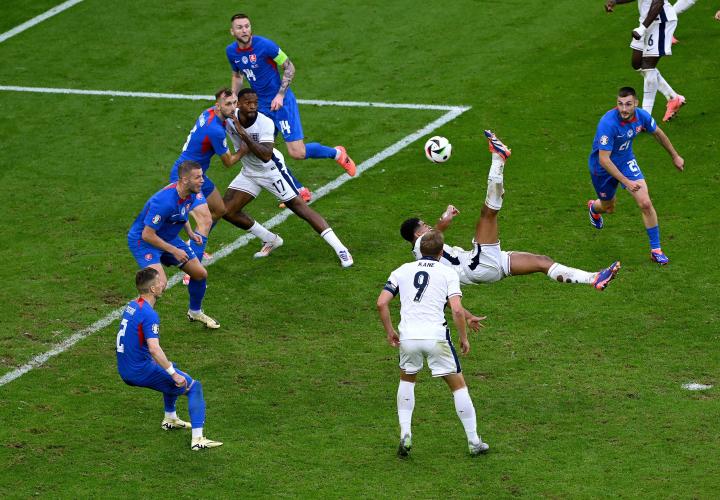 拥有豪华阵容的英格兰陷入了绝境,在欧洲杯小组赛只进两球头名出线后,英格兰被斯洛伐克逼到了悬崖边缘。0-1的比分即将完赛,94分34秒,沃克将球掷到禁区,格伊头球后蹭,贝林厄姆倒钩破门完成绝平!这位表现饱受争议的英格兰帝星,在那一刻救赎了自己,也救赎了英格兰,三狮军团最终也再次走进了决赛的舞台。
