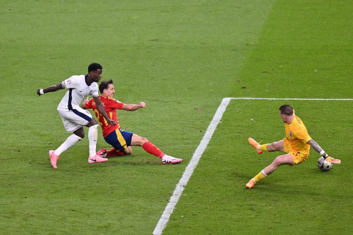 欧洲杯决赛的时钟走到第86分钟,西班牙队推进进攻,奥尔莫将球传给奥亚萨瓦尔,后者不停球敲给左路的库库雷利亚,随后前插禁区,接库库的低平球斜塞铲射破门!从重要性来说,这粒进球是2024年世界足坛含金量最高的一粒,它直接决定了德劳内杯的归属,西班牙2-1绝杀英格兰,第四次赢得欧洲杯冠军,成为名副其实的欧洲之王!