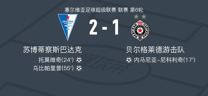 在塞尔维亚足球超级联赛第六轮的较量中,苏博蒂察斯巴达克坐镇主场迎战贝尔格莱德游击队。比赛中,贝尔格莱德游击队的内马尼亚-尼科利奇在纳特霍的助攻下率先为球队取得进球。随后,苏博蒂察斯巴达克的托莫维奇在巴比奇的助攻下扳平比分。比赛进入下半场,苏博蒂察斯巴达克的乌比帕里普在米吉奇的助攻下再下一城,帮助球队反超比分。最终,苏博蒂察斯巴达克以2-1战胜贝尔格莱德游击队,取得了本场比赛的胜利。