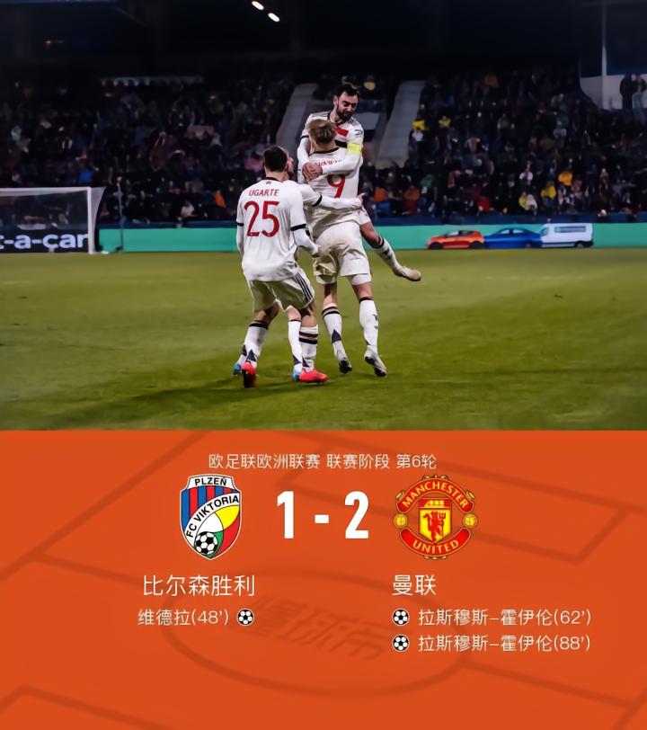 在欧足联欧洲联赛的较量中,比尔森胜利迎战曼联。上半场双方进攻机会寥寥,B费外围一记远射被扑制造了险情。下半场时奥纳纳低级失误送出大礼,维德拉推射破僵先拔头筹,霍伊伦直面门将的机会一脚低射被门将抱住,随后迪亚洛禁区突破推射被扑后,霍伊伦跟进补射破门将比分扳平,比赛进入到尾声阶段,B费战术定位球助攻霍伊伦梅开二度逆转胜局,随即全场战罢,最终,曼联以2比1逆转战胜比尔森胜利。