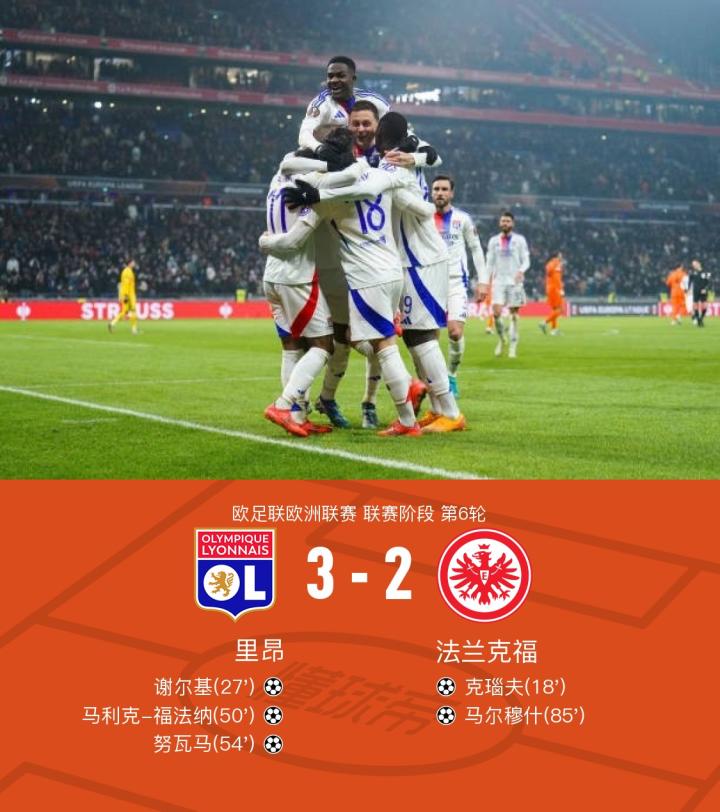 在欧足联欧洲联赛的较量中,里昂与法兰克福展开了一场激烈的对决。上半场,克瑙夫为客队先拔头筹,谢尔基帮助里昂扳平比分。下半场,马利克-福法纳建功,努瓦马兜射入死角。终场前,马尔穆什为客队扳回一城。全场比赛结束,里昂3-2逆转击败法兰克福。