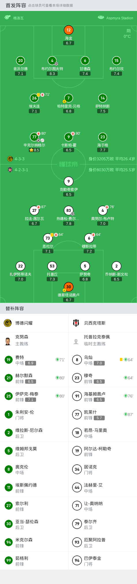 在欧足联欧洲联赛的较量中,博德闪耀迎战贝西克塔斯。比赛中,贝西克塔斯的热德松-费尔南德斯率先为球队取得进球。随后,博德闪耀的辛克尔纳格尔迅速扳平比分,并在接下来的比赛中助攻布约尔图夫特完成反超。最终,博德闪耀以2-1战胜贝西克塔斯,取得了比赛的胜利。
