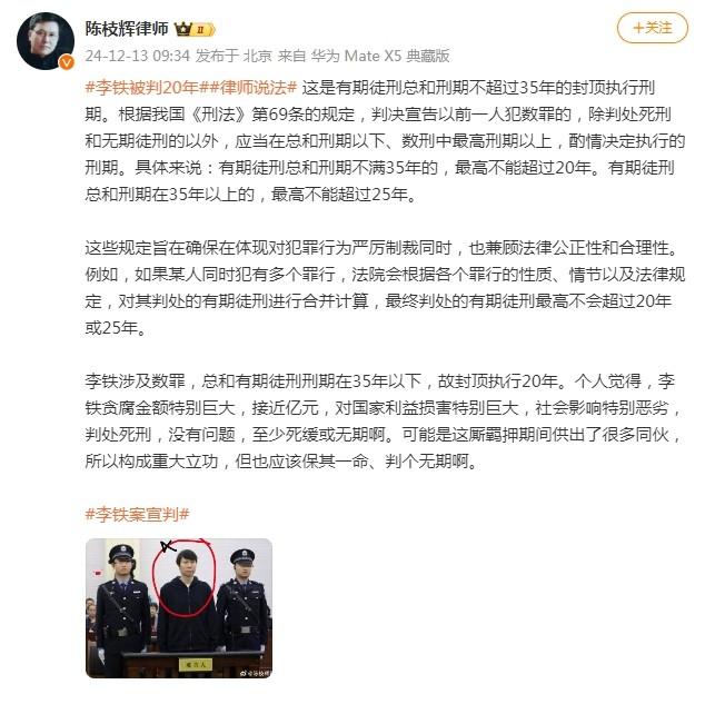 12月13日李铁案公开宣判,李铁被以受贿罪、行贿罪、单位行贿罪、非国家工作人员受贿罪、对非国家工作人员行贿罪数罪并罚判处有期徒刑二十年。随后,北京市京都律师事务所陈枝辉律师发文表示:“个人觉得,李铁贪腐金额特别巨大,对国家利益损害特别巨大,判处死刑没有问题,至少死缓或无期。可能他羁押期间供出了很多同伙,所以构成重大立功,但也应该保其一命、判个无期。”