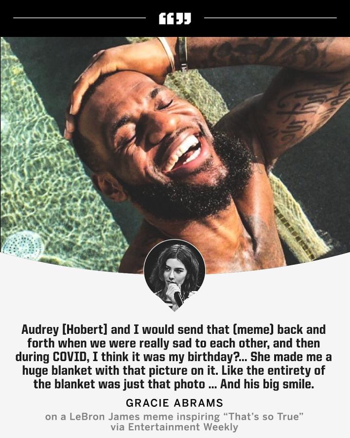 25岁的美国创作型歌手Gracie Abrams在接受采访时表示,她10月份发行的曲目《That's So True》的灵感来自于勒布朗-詹姆斯大笑的表情包。
