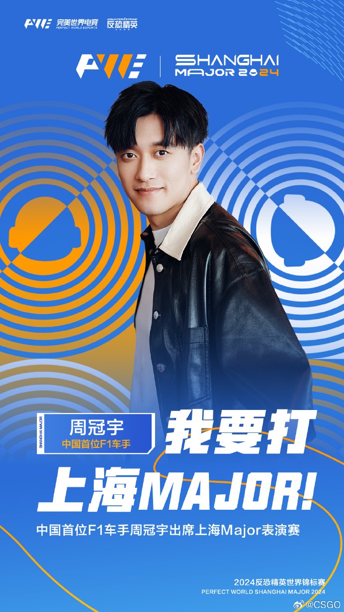 CSGO官方晒出了周冠宇的参赛海报并配文写道:“为大家揭晓2024上海Major表演赛首位选手——中国首位F1车手周冠宇!敬请期待。”