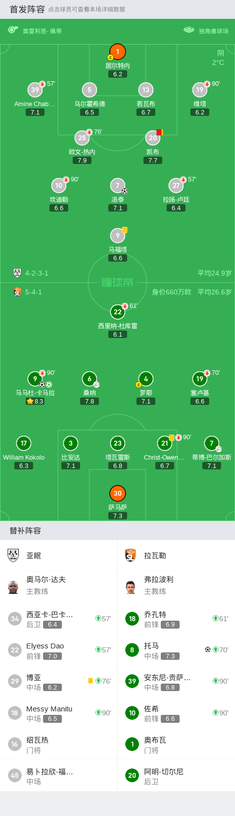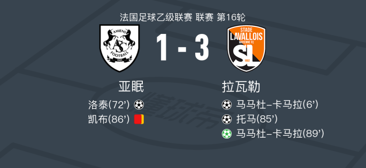 拉瓦勒3-1亚眠,马马杜-卡马拉梅开二度,托马建功