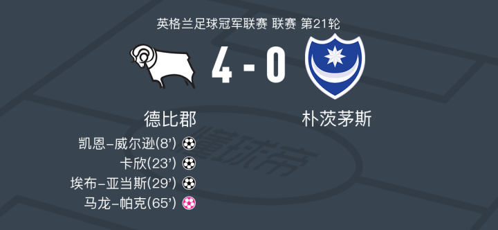 德比郡4-0大胜朴茨茅斯,埃布-亚当斯建功,卡欣破门