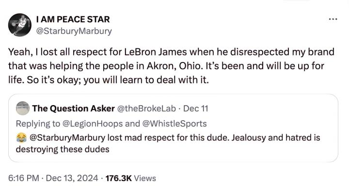 马布里回应道:“是的,当勒布朗-詹姆斯不尊重我的品牌时,我也对他失去了所有的尊重,因为我的品牌在帮助俄亥俄州阿克伦的人们,这就是事实,而且将持续一辈子。所以没关系,你要会学会处理它。”