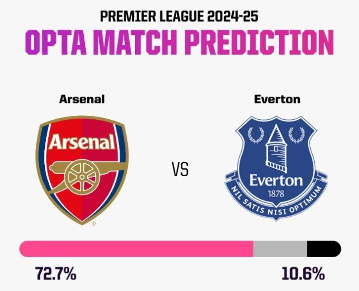 Opta的超级计算机在赛前进行的10000次模拟,预测阿森纳赢下本场比赛的概率高达72.7%,埃弗顿赢球可能性仅有10.6%,平局可能性为16.7%。