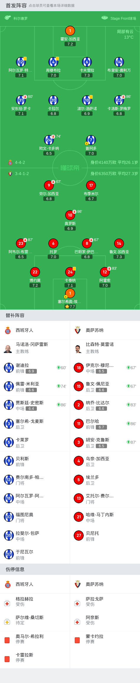 西班牙人0-0奥萨苏纳,洛萨诺远射造险,埃雷拉神扑战报bot @懂球帝2024-12-14 22:57在西班牙足球甲级联赛第17轮的较量中,西班牙人坐镇主场迎战奥萨苏纳。经过一场激烈的对决,双方均未能攻破对方球门,比赛以0-0的比分收场。两队在场上展现了顽强的防守和不懈的拼搏精神,尽管创造了一些得分机会,但始终未能将其转化为进球。最终,西班牙人和奥萨苏纳各自收获一分。点击查看本场比赛详细数据>>点击查看西甲完整积分榜>> 球队阵容 技术统计 展开更多