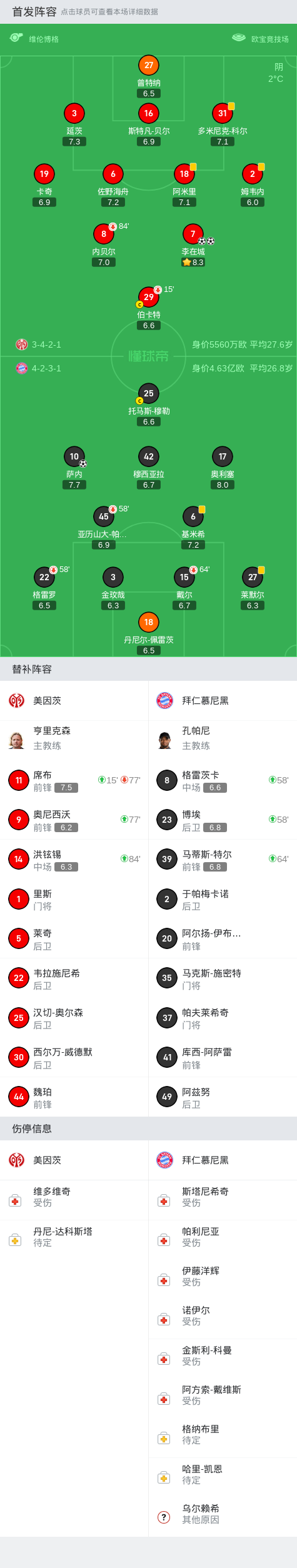第41分钟,李在城门前机敏勾射破门,拜仁客场0-1美因茨