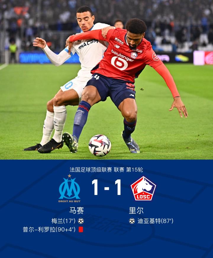 在法国足球顶级联赛第15轮的较量中,马赛坐镇主场迎战里尔。比赛中,马赛的梅兰在队友拉比奥的精妙传球下成功破门,为主队取得领先。随后,里尔的迪亚基特在卡贝拉的助攻下扳平比分。比赛接近尾声时,马赛的普尔-利罗拉被罚下场。最终,双方以1-1握手言和。