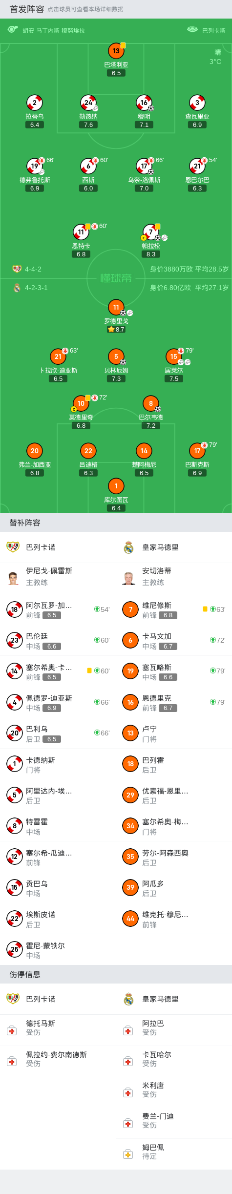 北京时间12月15日04:00,西甲第17轮继续进行,皇家马德里作客巴列卡斯球场挑战巴列卡诺,本场主裁判为穆努埃拉。上半场,巴列卡诺凭借乌奈-洛佩斯和穆明的进球取得两球优势;随后巴尔韦德轰世界波,贝林厄姆连续六轮西甲破门,皇马连扳两城追平。下半场,罗德里戈破门帮助皇马让二追三反超,帕拉松救主。最终,皇马客场3-3战平巴列卡诺。