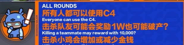 第13回合,所有人每15秒随机位移,仅能使用鸟狙。第14回合,所有人每15秒随机位移,高移速近战模式。第15回合,高移速近战模式,诱饵弹位移。
